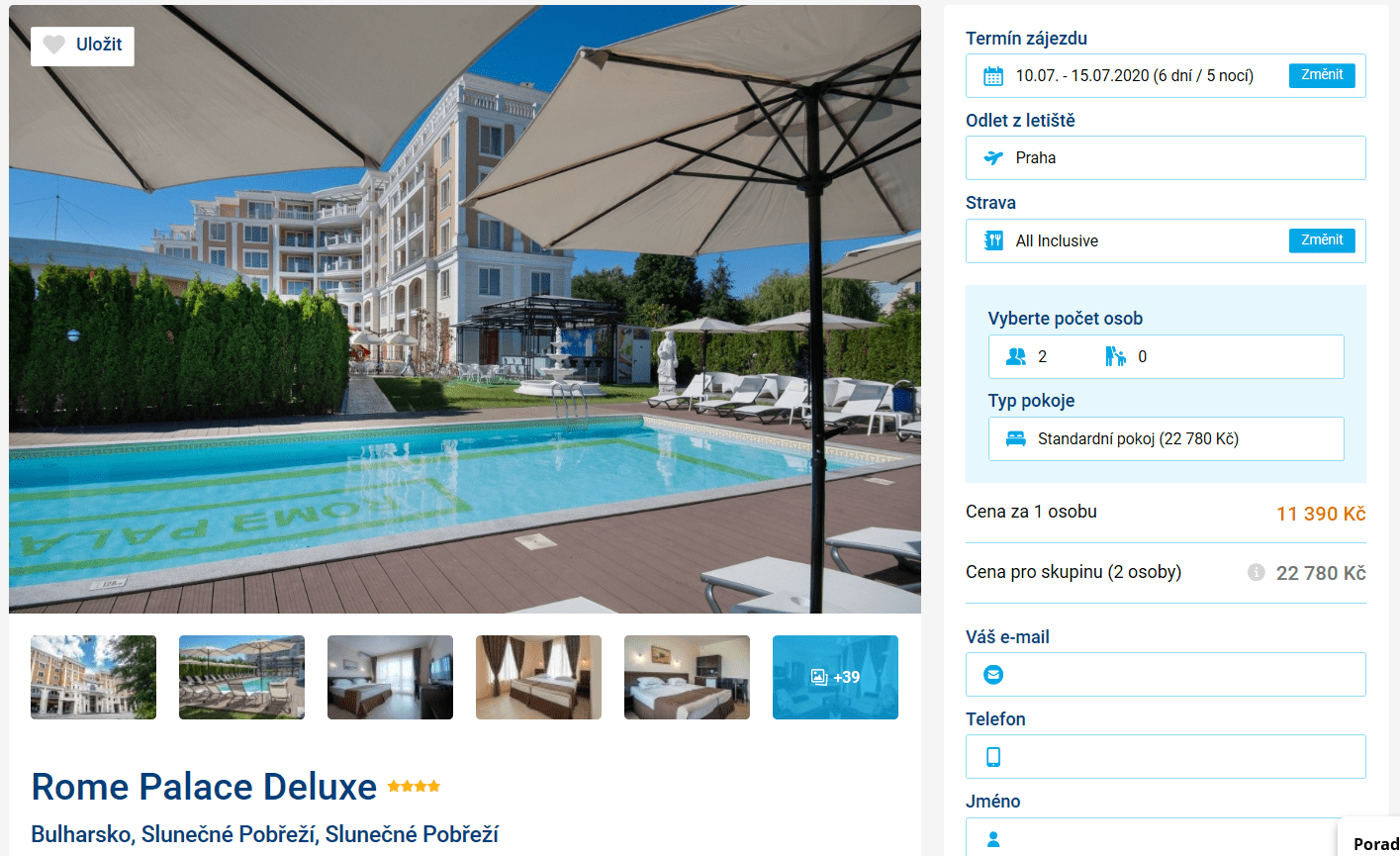 Rádi si dopřáváte odpočinek v krásně zařízených hotelech a zároveň se chystáte letos vyrazit do Bulharska? Pak určitě využijte akční nabídky cestovní kanceláře a vydejte se za 11 390 Kč na Slunečné Pobřeží. V ceně zájezdu máte zpáteční letenku z Prahy, dopravu na místě, služby delegáta, ubytování v krásném 4* hotelu se skvělým hodnocením a stravování formou All Inclusive na 6 dní. Podrobného průvodce po Bulharska si můžete přečíst zde.