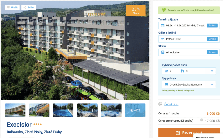 Láká vás dovolená v Bulharsku? V tom případě vám určitě padne do oka náš dnešní tip na zájezd! V nabídce cestovní kanceláře se objevil červnový zájezd do bulharského letoviska Zlaté Písky, který můžete aktuálně pořídit za cenu 8 990 Kč. V té jsou zahrnuty letenky (odlet z Prahy), letištní transfery v místě, ubytování na 8 dní, all inclusive stravování a služby delegáta. Před odletem určitě nakoukněte do našeho podrobného průvodce Bulharskem, ve kterém najdete spoustu tipů pro vaši cestu.