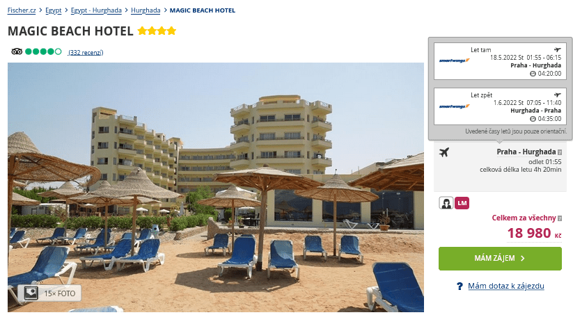 Předpověď počasí na nadcházející dny nevypadá růžově a proto je nejvyšší čas vyrazit za sluníčkem! Pokud si nevíte rady kam vyrazit, máme tu pro vás zájezd s cestovní kanceláří do Egypta. Vydat se můžete do letoviska Hurghada a to již zítra! Celá dovolená vás vyjde jen na 9 490 Kč a za tuto cenu pořídíte ubytování ve 4* hotelu na 15 dní, zpáteční letenky z Prahy, stravování formou All Inclusive, letištní transfery i služby delegáta. Hotel Magic Beach je navíc přímo u písečné pláže a v bezprostřední blízkosti najdete i několik obchodů. Pro inspiraci nezapomeňte nahlédnout do našeho online průvodce Egyptem, ve kterém najdete tipy na výlety a informace o jednotlivých letoviscích.