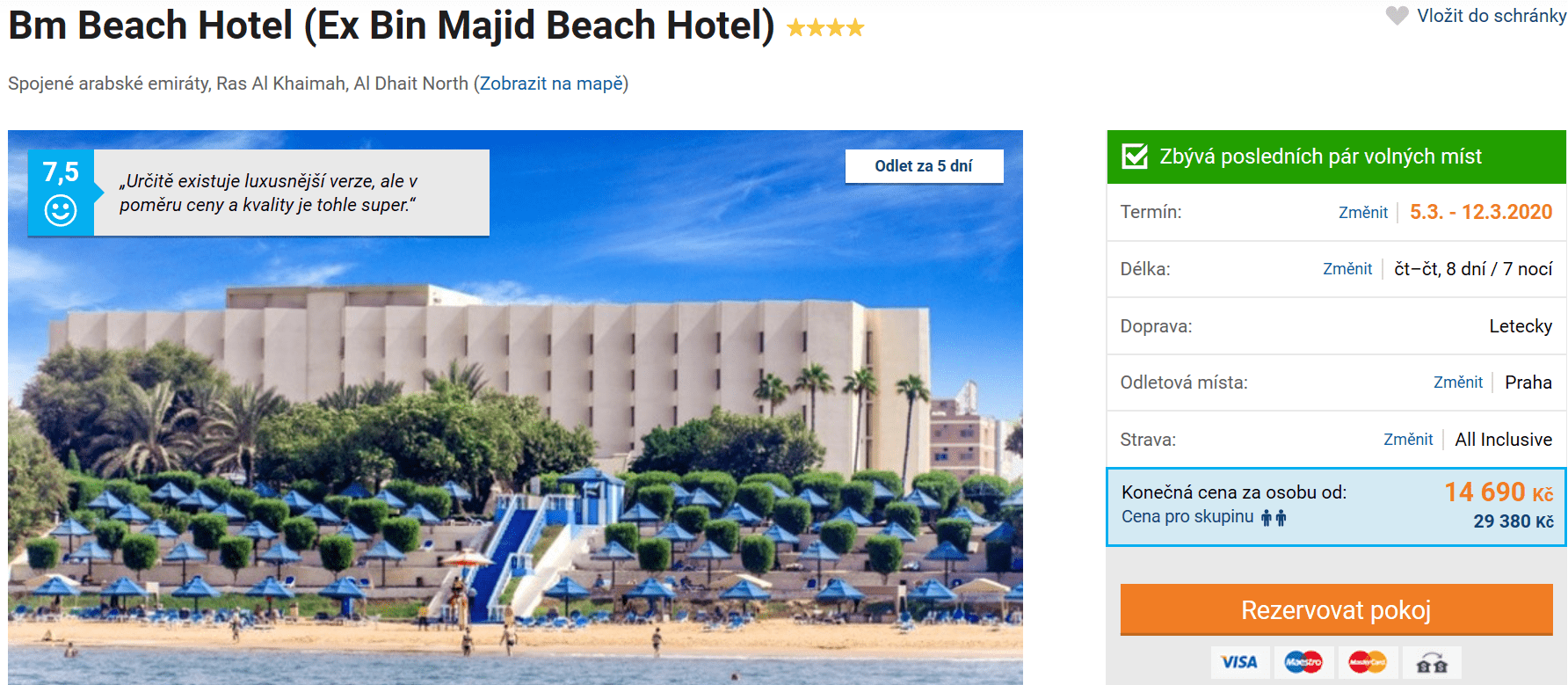 Co takhle vyrazit již následující čtvrtek do sluncem vyhřátých Spojených arabských emirátů a užít si ničím nerušený odpočinek? Jestliže vás tato představa láká, využijte akční nabídky cestovní kanceláře za skvělých 14 690 Kč! V této ceně máte zpáteční letenku z Prahy, dopravu na místě, služby delegáta, ubytování ve 4* hotelu a stravování formou All Inclusive. Do odletu ještě pár dní zbývá, stejně tak však na zájezdu zbývá i posledních pár míst. Proto s nákupem určitě neotálejte!