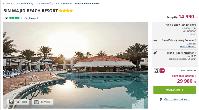 Hledáte dovolenou a oslovily vás Spojené arabské emiráty? Vydejte se s naším tipem do Ras Al Khaimah! Zájezd, který se objevil v nabídce cestovní kanceláře Fischer, vás vyjde jen na 14 990 Kč a zahrnuje ubytování ve 4 hvězdičkovém resortu Bin Majid Beach s All Inclusive na 8 dní, zpáteční letenky z Prahy, letištní transfery a služby delegáta. Pokud si potrpíte na kvalitní zázemí a nevadí vám si maličko připlatit, za 15 290 Kč je k mání ještě jeden zájezd s lépe hodnoceným ubytováním v hotelu Hampton by Hilton Marjan Island . Oba pobyty se konají v termínu 30.5. – 6.6.2022, je tak pomalu na čase si začít zařizovat vše potřebné.