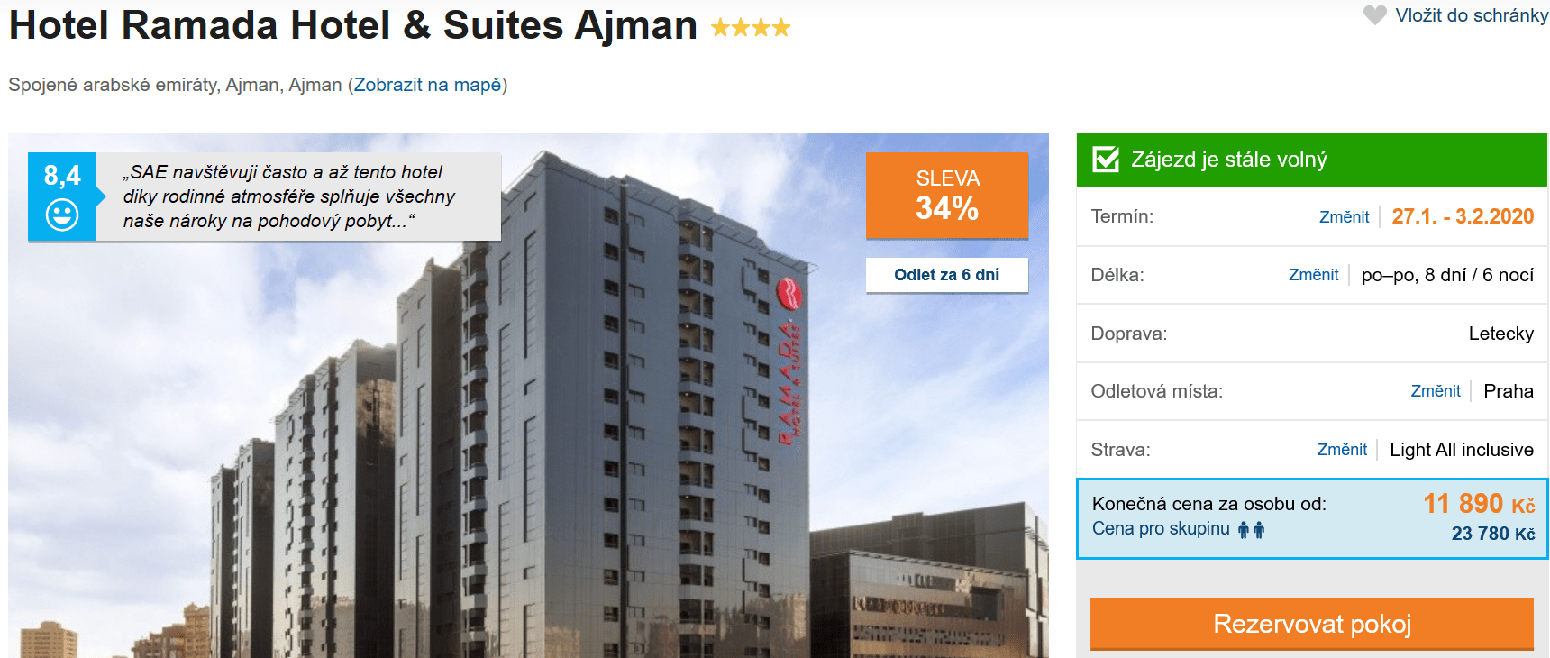 Už dlouho vás láká návštěva Spojených arabských emirátů? Pak využijte některé z nabídek cestovní kanceláře, kdy už bude jen na vás, zda dáte přednost pobytu pouze se snídaní či s All Inclusive. Zájezd v ceně 7990 Kč obsahuje zpáteční letenky z Prahy, dopravu na místě, služby delegáta, ubytování a již zmíněné snídaně. Druhý zájezd, jehož cena činí 11 890 Kč, naopak nabízí All Inclusive a ubytování ve výborně hodnoceném 4* hotelu. Obě letoviska jsou navíc v blízkosti Dubaje, můžete tedy bez problému vyrazit na nezapomenutelný výlet.