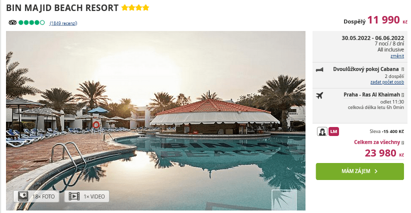 Stále hledáte tu pravou dovolenou? Inspirací vy vám mohl být pobyt s cestovní kanceláří do Spojených arabských emirátů a to již na přelomu května a června. Celý pobyt vás vyjde na 11 990 Kč a cena zahrnuje ubytování v hotelu na 8 dní, zpáteční letenky z Prahy, balíček All Inclusive, letištní transfery a služby delegáta. Hotel Bin Majid Beach Resort je vhodný jak pro jednotlivce, tak páry i rodiny s dětmi. V bezprostřední blízkosti najdete dlouhou písečnou pláž s pozvolným vstupem do moře a lehátka i slunečníky jsou k dispozici zdarma.