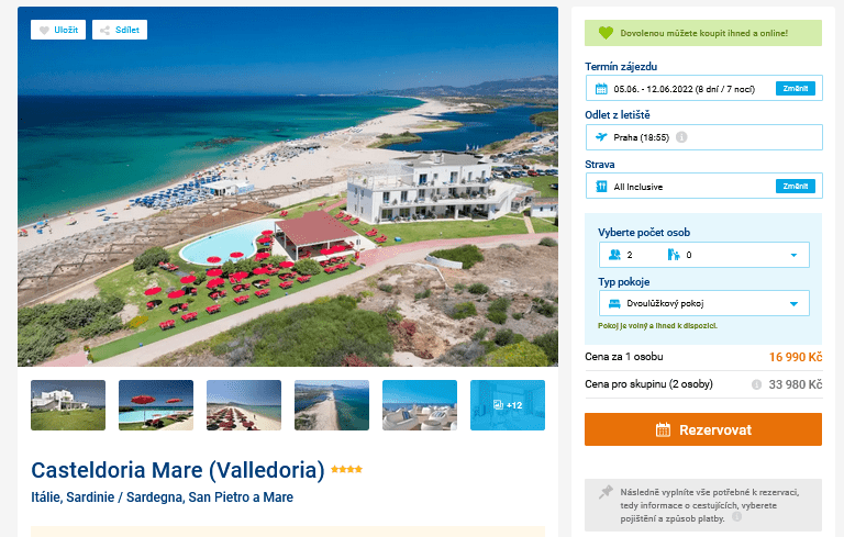 Chystáte se letos na dovolenou na Sardinii? Pokud nejste dobrodruzi a raději využijete služeb cestovní kanceláře, máme pro vás skvělý tip! V nabídce se objevil zájezd do letoviska San Pietro a Mare, za který zaplatíte jen 16 990 Kč. Cena zahrnuje ubytování ve 4 hvězdičkovém hotelu na 8 dní, stravování formou All Inclusive, zpáteční letenky z Prahy, služby delegáta a letištní transfery. Odlet je až za měsíc, takže si v klidu stihnete naplánovat bohatý program. Sardinie totiž rozhodně stojí za procestování. Tipy na výlety najdete v našem online průvodci Sardinií.