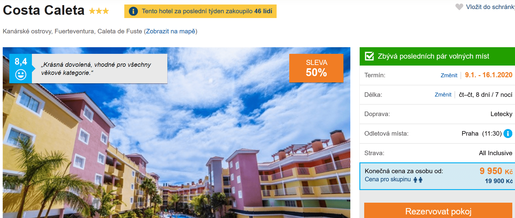 Jestliže byste si rádi po novém roce odskočili na dovolenou k moři či zkrátka a jednoduše chcete někomu udělat na Vánoce radost zážitkem, využijte akční nabídky cestovní kanceláře a vydejte se na Fuerteventuru (Kanárské ostrovy). V ceně 9950 Kč máte kompletní dovolenou – zpáteční letenku z Prahy, dopravu na místě, služby delegáta, ubytování ve skvěle hodnoceném hotelu (na Invii získal 8,4/10) a stravování formou All Inclusive. Podrobného průvodce po Fuerteventuře zdarma naleznete zde. I přes to, že je dolet až 9. ledna, zájezd je téměř vyprodaný, proto s nákupem určitě neotálejte.
