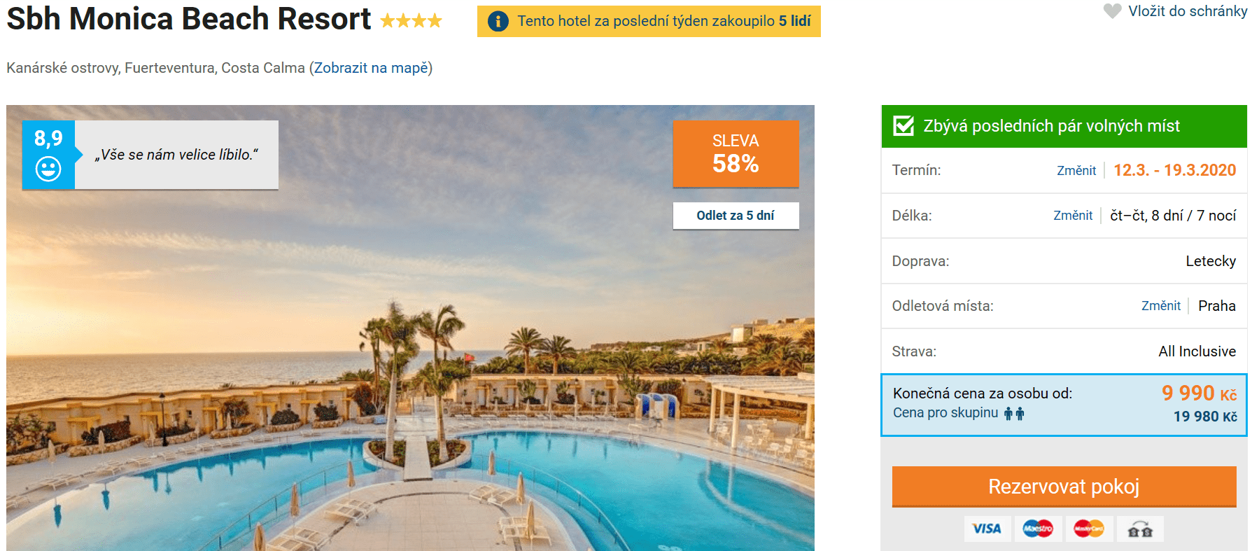 Překrásný hotel s výhledem na moře, pláž s vyhřátým pískem a ničím nerušený odpočinek po celý týden. Zdá se vám to jako sen? Jestliže ano, můžete si ho splnit hned následující čtvrtek, a to v případě, že využijete nabídky cestovní kanceláře za 9990 Kč! Za tuto cenu aktuálně zakoupíte zájezd na krásnou Fuerteventuru s odletem z Prahy. Krom zpátečních letenek máte v ceně i dopravu na místě, služby delegáta, ubytování ve výborně hodnoceném 4* resortu a stravování formou All Inclusive. Více informací o ostrově se dozvíte v našem podrobném průvodci zdarma. Zájezd je téměř vyprodaný, s rezervací svého místa tedy určitě neváhejte!
