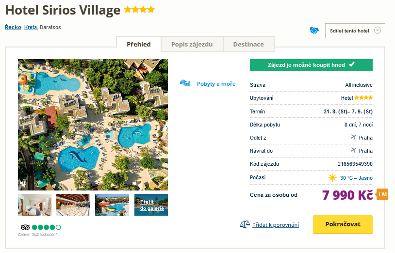 Pozor, tento tip je pouze pro spontánní cestovatele! V nabídce Super Last Minute pobytů se objevil zájezd na Krétu s odletem již zítra brzy ráno. Proto na nic nečekejte, zvedněte telefon a rezervujte. V mezičase si stihnete zabalit kufry a zajistit parkování na letišti. Cena 7 990 Kč zahrnuje ubytování v hotelu s programem All Inclusive, zpáteční letenky z Prahy, letištní transfery a služby delegáta. Před cestou nezapomeňte nakouknout do našeho podrobného průvodce Krétou, ve kterém najdete rady a tipy na výlety.