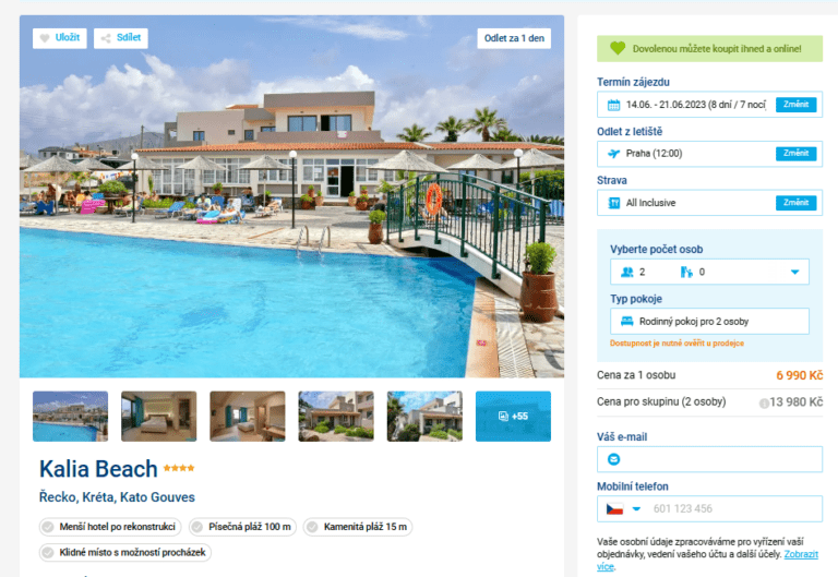 Rádi byste vyrazili na řecké ostrovy? V nabídce cestovní kanceláře se objevil zlevněný zájezd na Krétu za skvělou cenu 6990 Kč. V té jsou započítány letenky (odlet z Prahy), letištní transfery v místě, ubytování na 8 dní, all inclusive stravování i služby delegáta. Hotel Kalia Beach je v recenzích skvěle hodnocen a je ideální pro všechny, kteří hledají klidnou dovolenou. S rezervací příliš dlouho neváhejte, odlet je již zítra.