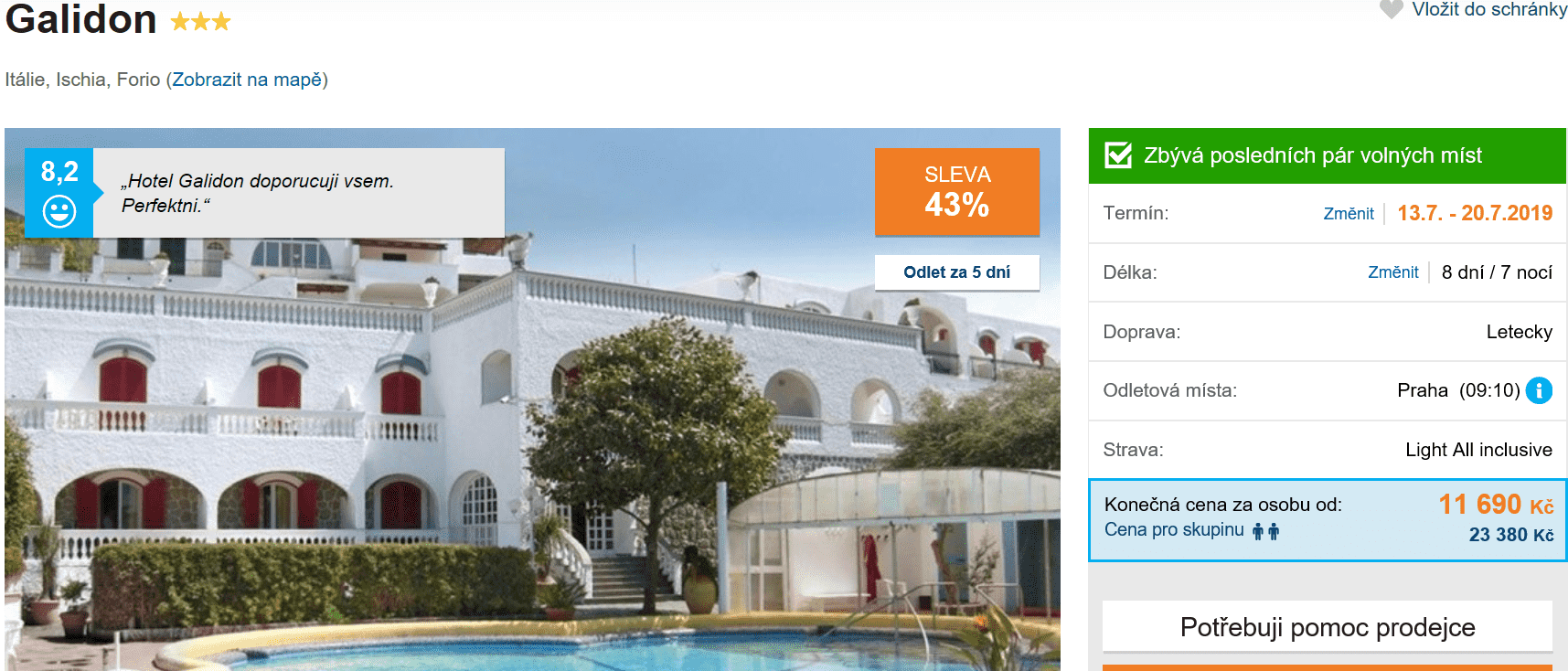 Jste milovníci italské kultury, přírody či kuchyně? Všechny tyto věci můžete skvěle skloubit dohromady, zakoupíte-li last minute zájezd na překrásný italský ostrov Ischia. Zájezd přes cestovní kancelář nyní zakoupíte již za skvělých 11 690 Kč! V této ceně máte kompletní dovolenou – zpáteční letenku z Prahy, dopravu na místě, služby delegáta, ubytování ve skvěle hodnoceném hotelu (na Invii získal 8,2/10) a stravování formou All Inclusive. S rezervací zájezdu rozhodně neotálejte, zbývá již posledních pár míst!