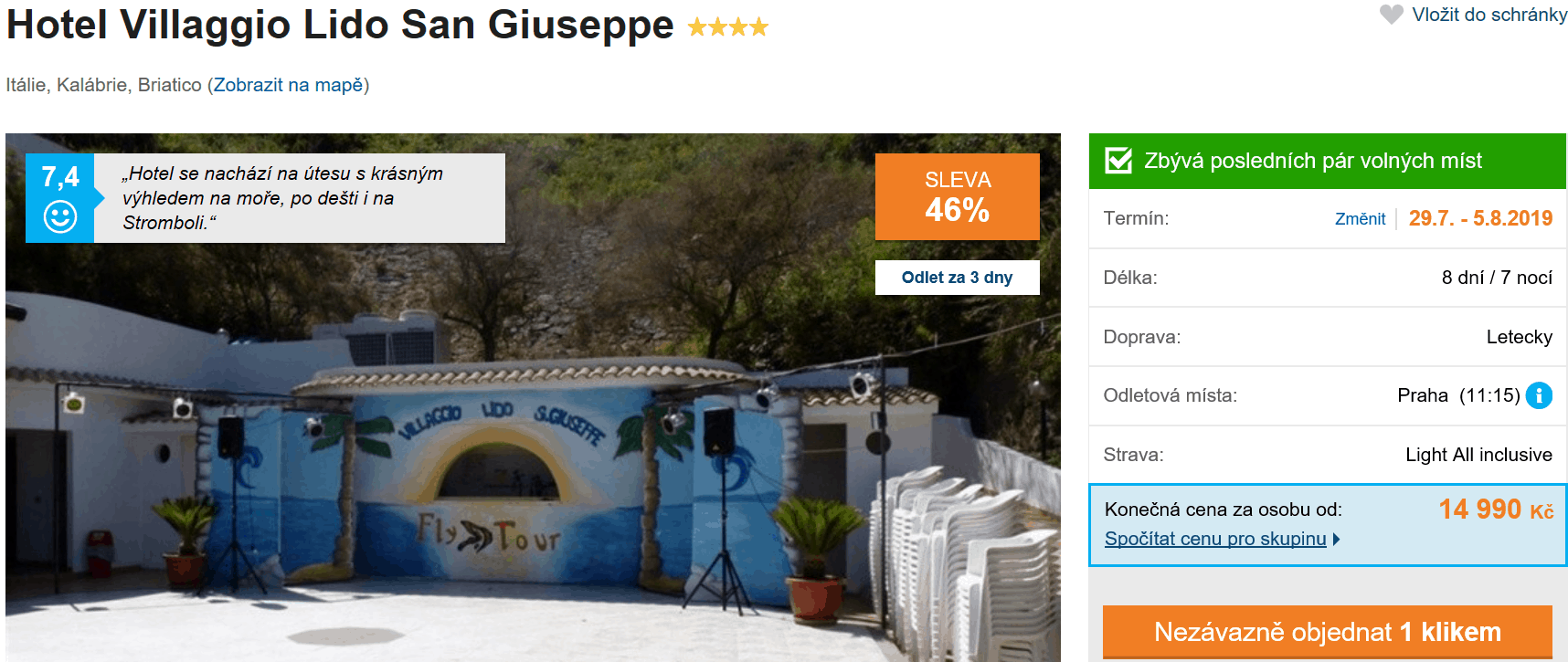 Jestliže jste doposud nenavštívili Kalábrii, jednu z nejkrásnějších oblastí celé Itálie, určitě byste si neměli nechat ujít akční nabídku cestovní kanceláře Čedok, u které nyní zakoupíte last minute zájezd již za skvělých 14 990 Kč! V této ceně máte zpáteční letenku z Prahy, dopravu na místě, služby delegáta, ubytování ve 4* hotelu a stravování formou All Inclusive. Podrobného průvodce po Itálii zdarma naleznete zde. Zájezd je téměř vyprodaný, proto určitě s rezervací neotálejte!