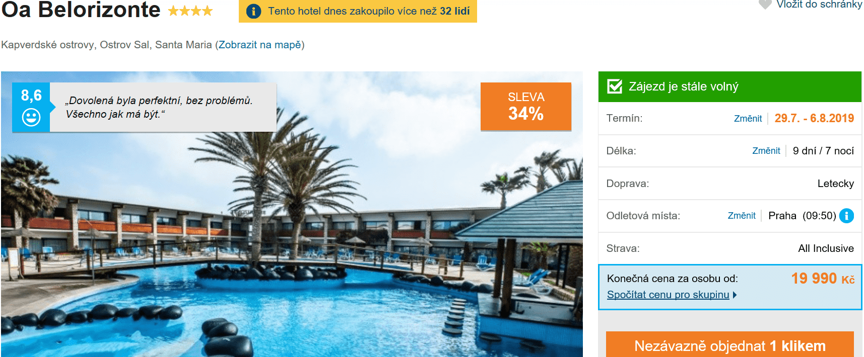 Láká vás dovolená v exotice a přitom za skvělou cenu i během hlavní sezony? V tom případě neotálejte a zarezervujte si svůj zájezd na překrásné Kapverdské ostrovy. Zájezd přes cestovní kancelář nyní zakoupíte za skvělých 19 990 Kč! V této ceně máte zpáteční letenku z Prahy, dopravu na místě, služby delegáta, ubytování ve 4* hotelu a stravování formou All Inclusive po celých 9 dní!