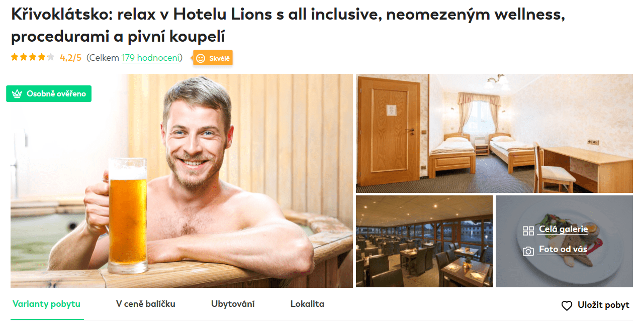 Jestliže patříte mezi milovníky wellness a rádi čerpáte novou energii na masážích a lázeňských procedurách, určitě by vám neměla uniknout akční nabídka, která vás zavede na Křivoklátsko. V ceně 4990 Kč zakoupíte poukaz pro dvě osoby na 3 dny, v jehož ceně máte ubytování v hotelu Lions, All Inclusive, pivní koupel, neomezený vstup do wellness, různé procedury, ale i sportovní vyžití dle výběru. Poukaz pak můžete využít až do konce února 2021. Na pobyt musíte však vždy nastoupit v neděli.