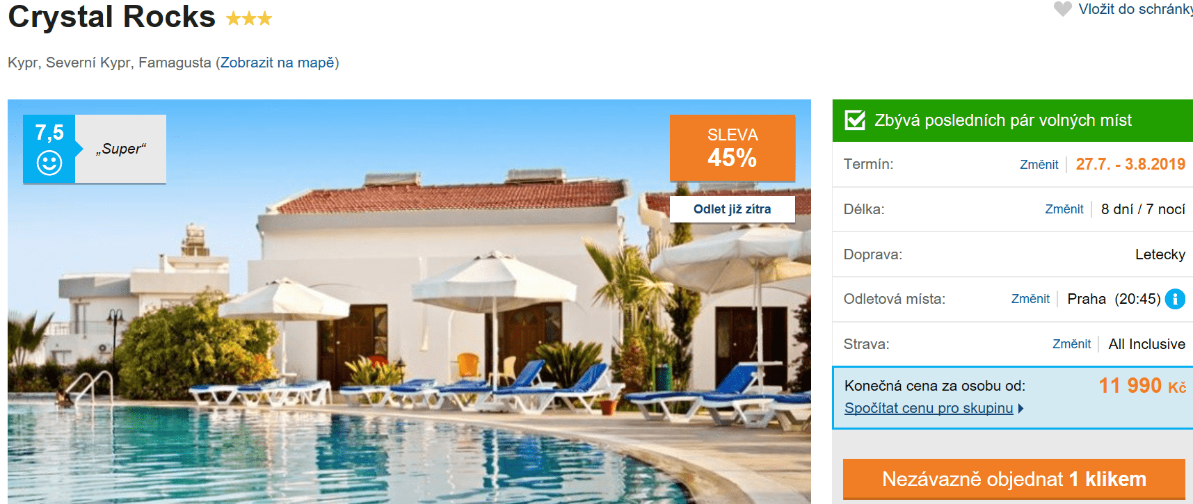 Stále čekáte na ideální nabídku last minute zájezdu? Rozhodování vám může ulehčit akční nabídka cestovní kanceláře, se kterou se můžete na celých 8 dní vydat na překrásný Kypr! V ceně 11 990 Kč máte zpáteční letenku z Prahy, dopravu na místě, služby delegáta, ubytování a stravování formou All Inclusive. Inspiraci na cestování po Kypru můžete načerpat v našem podrobném průvodci, který si zcela zdarma můžete přečíst zde. Odlet je již zítra, proto v případě zájmu s rezervací určitě neotálejte!