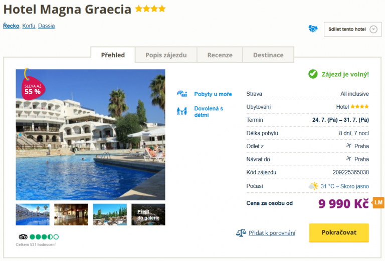 Víkend se neodvratně blíží a vy ještě nevíte, co podniknete? Co si takhle sbalit kufry a vyrazit k moři? Za skvělou cenu 9990 Kč teď můžete vyrazit na krásné Korfu, a to na celých 8 dní. V ceně zájezdu máte zahrnuty zpáteční letenky z Prahy, dopravu na místě, služby delegáta, ubytování ve 4* hotelu a stravování formou All Inclusive. Podrobného průvodce po Korfu zcela zdarma si pak můžete přečíst zde