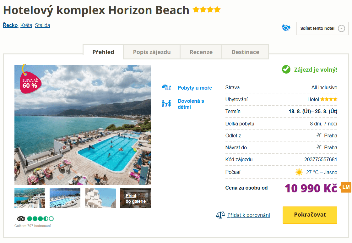 Další last minute nabídka a další řecký ostrov. Tentokrát se však můžete za skvělých 10 990 Kč vydat na oblíbenou Krétu. V ceně zájezdu máte zpáteční letenku z Prahy, dopravu na místě, služby delegáta, ubytování v krásném 4* hotelu a stravování formou All Inclusive na 8 dní. Inspiraci na výlety po okolí můžete načerpat v našem podrobném průvodci zdarma. Odlet je však již zítra, v případě zájmu tedy s rezervací neotálejte.