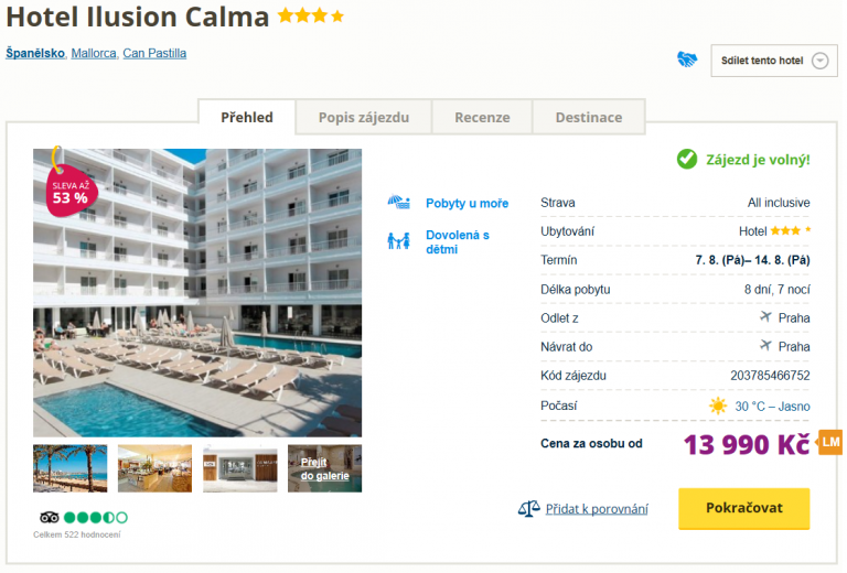 Horké španělské slunce, dokola rozléhající se moře a celé dny trvající odpočinek. Zdá-li se vám to jako ideální kombinace, využijte akčního zájezdu cestovní kanceláře Čedok a zaleťte si již zítra na Mallorku. V ceně 13 990 Kč máte zpáteční letenku z Prahy, dopravu na místě, služby delegáta, ubytování ve skvěle hodnoceném hotelu (na Invii má 4,1/5*) a stravování formou All Inclusive na 8 dní. Podrobného průvodce s inspiracemi na výlet pak můžete naleznete zde.