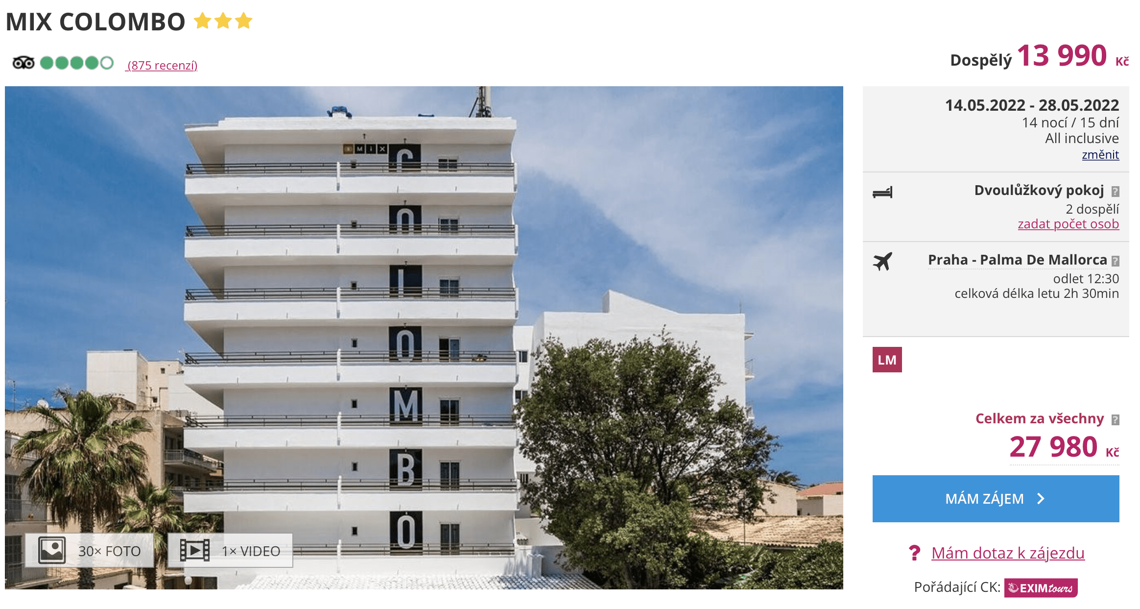 Máte v následujících dnech dovolenou a nevíte kam vyrazit? V nabídce cestovní kanceláře se objevil výhodný 15denní all inclusive zájezd na Mallorcu! Cena zájezdu 13 990 Kč zahrnuje zpáteční letenky z Prahy, letištní transfery v místě pobytu, ubytování na 14 nocí, stravování formou all inclusive a služby delegáta. Jedná se o skvělou cenovou nabídku a je možné, že nastala chyba v nacenění zájezdu. Nicméně to za pokus určitě stojí! Před cestou nezapomeňte nahlédnout do našeho online průvodce Mallorcou, kde najdete informace o ostrově a tipy na zajímavá místa.