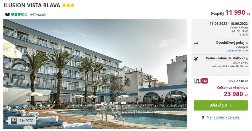 Vyhrála u vás letos Mallorca, ale zatím jste s nákupem dovolené vyčkávali? Pokud spoléháte na nabídky Last minute pobytů, uděláme vám radost tímto příspěvkem, ve kterém vám ukážeme zájezd s cestovní kanceláří do letoviska Cala Millor. Dovolená startuje již tuto sobotu a za cenu 11 990 Kč se vám CK postará o ubytování na 8 dní v hotelu se stravou All Inclusive, zpáteční letenky z Prahy, letištní transfery a pro všechny případy vám k ruce bude delegát. Hotel Ilusion Vista Blava je vhodný jak pro jednotlivce, tak pro rodiny s dětmi. Písečná pláž se nachází jen 300m od hotelu a mimo odpočinku si zde můžete užívat i vodních sportů. Než vyrazíte na Mallorcu, nechte se inspirovat v našem podrobném průvodci ostrovem. Najdete zde tipy na výlety a zajímavá místa i praktické rady na cestu.