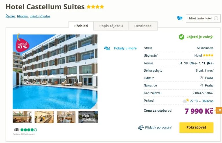 Nestihli jste vyčerpat letošní dovolenou a rádi byste se jeli někam ještě na pár dní ohřát? Pokud se na dovolenou rádi chystáte s předstihem, mohl by se vám líbit náš dnešní tip na zájezd s cestovní kanceláří. Vypravit se můžete do slunného Řecka a to v termínu 31.10. – 7.11.2021. Za 7 990 Kč o vás bude královsky postaráno, jelikož cena zahrnuje ubytování ve čtyřhvězdičkovém hotelu s programem All Inclusive, zpáteční letenky z Prahy, letištní transfer a služby delegáta v místě pobytu. Hotel Castellum Suites leží v samém srdci města Rhodos a na pláž se můžete projít příjemnou procházkou. Vřele vám doporučujeme i pronájem auta k podniknutí výletů po ostrově. Před cestou se můžete inspirovat v našem podrobném online průvodci Rhodosem.