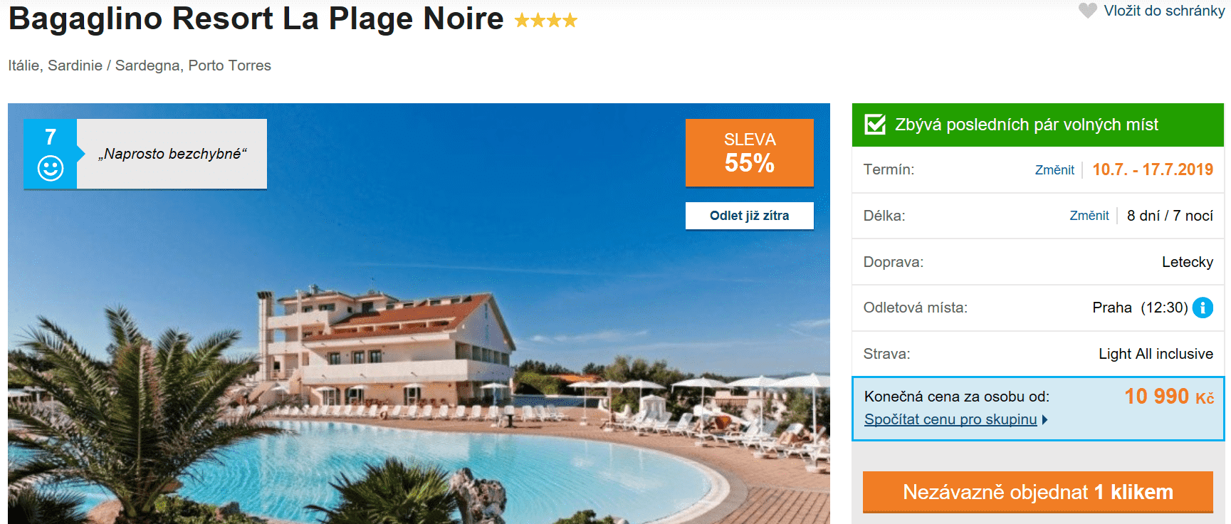Průzračná voda, vysoké hory, okouzlující příroda – toto vše a mnohem víc vás čeká, jestliže zakoupíte last minute zájezd na překrásnou Sardinii. Zájezd přes cestovní kancelář nyní zakoupíte za úžasných 10 990 Kč! V této ceně máte zpáteční letenku z Prahy, dopravu na místě, služby delegáta, ubytování a stravování formou All Inclusive po celých 8 dní! Inspiraci na cestu můžete načerpat v našem podrobném průvodci po Sardinii. S rezervací zájezdu však neváhejte, zbývá posledních pár míst!