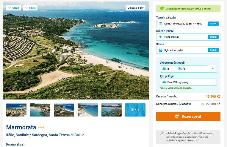 Vydejte se poznat krásy smaragdového ostrova, jak se přezdívá druhému největšímu ostrovu Středozemního moře! Již tuto neděli si můžete užívat báječnou dovolenou na ostrově Sardinie, kterou pořídíte díky našemu akčnímu tipu. Za 13 990 Kč se vám cestovní kancelář postará o ubytování v hotelu na 8 dní, stravu All Inclusive, zpáteční letenky z Prahy, letištní transfery a k ruce vám bude zkušený delegát. Hotel Marmorata leží v destinaci Santa Teresa di Gallur a k písečné pláži to budete mít jen 150m. Před odletem se nezapomeňte inspirovat v našem online průvodci Sardinií, kde najdete informace o ostrově i tipy na výlety.