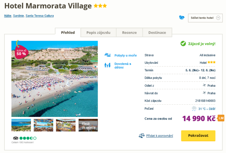 Pokud stále nemáte vybranou dovolenou, můžete se díky našemu tipu vydat na Sardinii. V nabídce se objevil zájezd s ubytováním v hotelu Marmorata, který stojí v letovisku Santa Teresa di Gallur a díky jeho umístění v mírném kopci si můžete užívat příjemný výhled na moře. Celý pobyt vás vyjde na 14 990 Kč a cestovní kancelář se vám postará o ubytování na 8 dní se stravou All Inclusive, zpáteční letenky z Prahy, letištní transfery a k ruce budete mít delegáta. Než vyrazíte, inspirujte se v našem online průvodci Sardinií, kde najdete informace o ostrově a tipy na výlety. Zájezd se koná v termínu 5.6. – 12.6.2022.