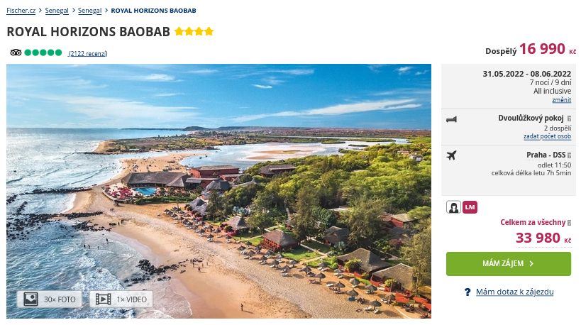 Napadlo vás někdy navštívit Senegal? Pokud ne, můžete to letos hravě napravit a to hned začátkem června. Zájezd organizuje cestovní kancelář Fischer a za cenu 16 990 Kč se vám postará o ubytování na 9 dní se stravováním formou All Inclusive, zpáteční letenky z Prahy, letištní transfery a k ruce vám bude i delegát. Hotel Royal Horizons Baobab se rozkládá na pobřeží Petit Cote, které lemuje dlouhá písečná pláž a je zakončena lagunou La Somone. Příjemnou procházkou je v dosahu i centrum města s nákupními možnostmi.