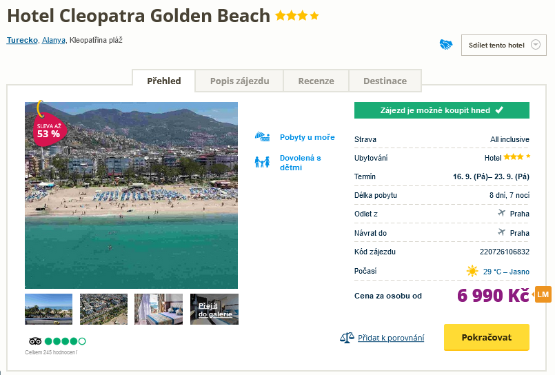 Máte možnost si vzít dovolenou prakticky kdykoli? Pak by rozhodně byla škoda, kdybyste si nechali téct tuto výhodnou nabídku na pobyt s cestovní kanceláří v Turecku. Za cenu 6 990 Kč koupíte zpáteční letenky z Prahy, letištní transfery, stravu All Inclusive i služby delegáta. Ubytováni budete v hotelu Cleopatra Golden Beach, který leží jen kousíček od krásné písčité pláže. Před cestou se určitě inspirujte v našem online průvodci Tureckem, ve kterém najdete tipy na výlety a informace o zemi.