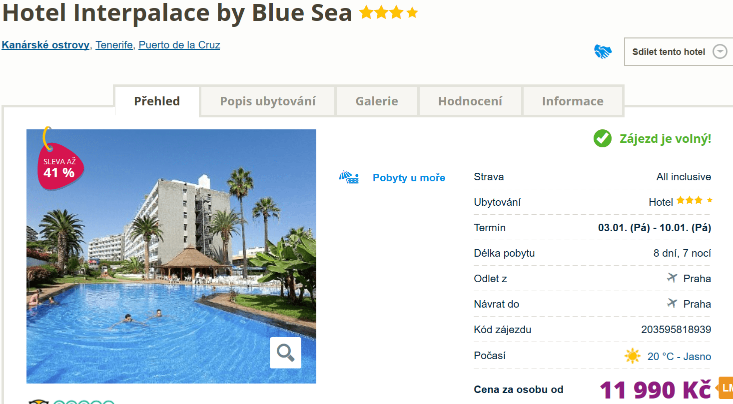 Ani před Vánoci nezahálíme a přinášíme vám skvělou akční nabídku cestovní kanceláře, která vás tentokrát zavede na krásné Kanárské ostrovy, konkrétně na ostrov Tenerife. V ceně 11 990 Kč máte kompletní dovolenou – letenku z Prahy (tam i zpět), dopravu na místě, služby delegáta, ubytování ve skvěle hodnoceném hotelu (na Invii získal 8/10) a stravování formou All Inclusive po celých 8 dní! Více informací o Tenerife si můžete přečíst v našem podrobném průvodci zdarma.