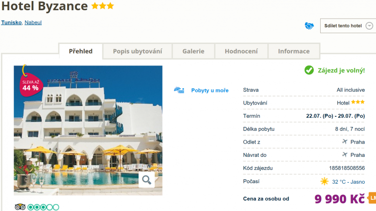 Jestliže jste měli pro letošní dovolenou v plánu vyměnit tradiční destinace za něco exotičtějšího, mohla by vás zaujmout aktuální nabídka cestovní kanceláře, u které zakoupíte zájezd do slunného Tuniska. V ceně 9990 Kč máte zpáteční letenku z Prahy, dopravu na místě, služby delegáta, ubytování a stravování formou All Inclusive po celých 8 dní!