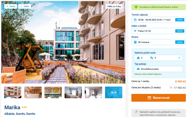 Sháníte cenově dostupnou dovolenou u moře? Pak vám vřele doporučujeme nechat se inspirovat naším dnešním tipem a vyrazit s cestovní kanceláří do Albánie. Za 8 990 Kč pořídíte ubytování v hotelu na 9 dní, stravu All Inclusive, leteckou dopravu, transfery a služby delegáta. Hotel Marika je nově zrekonstruovaný a v jeho blízkosti najdete obchody, bary i restaurace. Písečná pláž je přes ulici a hoteloví hosté mají lehátka a slunečníky zdarma. Odlet z Prahy je již 29.8., s rezervací proto dlouho nečekejte.