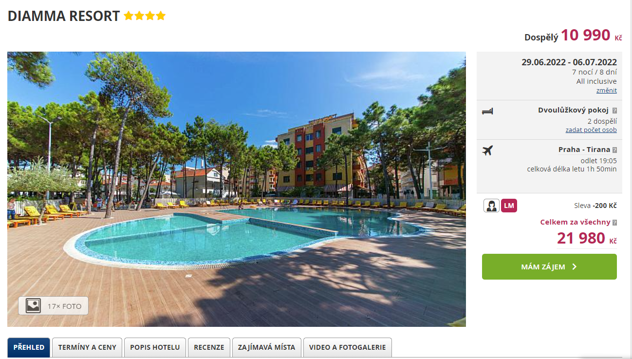 Již delší dobu přemýšlíte o dovolené v nějaké turisticky méně profláklé destinaci? Díky našemu akčnímu tipu se již zítra můžete vydat do nádherné Albánie. Kompletně zařízený zájezd do 4hvězdičkového resortu můžete aktuálně pořídit za cenu 10 990 Kč. V této ceně jsou zahrnuty letenky s odletem z Prahy, letištní transfery v místě, ubytování na 7 nocí, stravování formou All Inclusive a služby delegáta. Hotel se nachází v borovicovém háji přímo u pláže v oblíbením albánském letovisku Dürres. Co vidět a zažít v Albánii se dočtete zde.