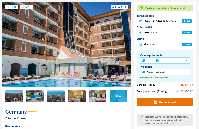 Propadáte panice, protože termín vaší dovolené se neúprosně blíží a vy ještě nemáte rezervovaný pobyt? Pravdou je, že se začátkem léta se nabídka volných zájezdů výrazně ztenčila a ty nejlepší nabídky uloví jen ti nejrychlejší. S našimi tipy si ale hravě vyberete i vy! Dnes vám přinášíme zájezd do 5* hotelu v Albánii, za který zaplatíte 16 490 Kč. Kromě ubytování zahrnuje cena i program All Inclusive, zpáteční letenky, letištní transfery a služby delegáta. Odlet z Prahy je navíc až 11.7.2022, v klidu si tak stihnete nejen pobalit, ale i zařídit vše podstatné. Co vidět a zažít v Albánii se dočtete v našem online průvodci.
