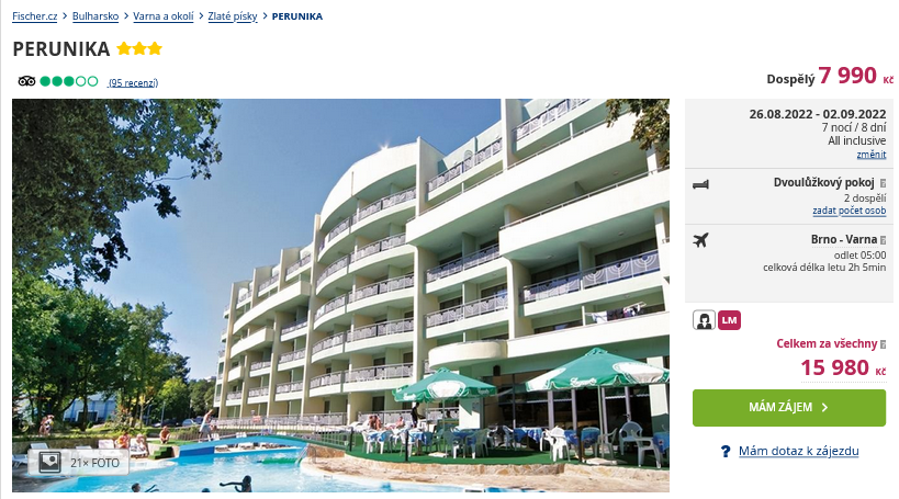 Dovolenou v hotelu Perunika v termínu 26.8. – 2.9. 2022 můžete rezervovat zde >> Nezapomeňte si prohlédnout recenze hostů, kteří zde byli před vámi.