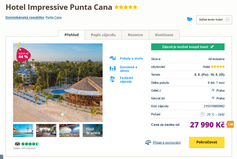 Máte rádi slevy? Pak se vám určitě bude líbit zájezd s cestovní kanceláří do Dominikánské republiky, o kterém jsem vám již v tomto týdnu jednou psali. Nová cena za dovolenou v 5* resortu na 9 dní je 27 990 Kč a balíček dále zahrnuje zpáteční letenky z Prahy, stravu All Inclusive, letištní transfery a služby delegáta. Celý pobyt se uskuteční v termínu 8.8. – 16.8.2022, je tak nejvyšší čas začít balit kufry.