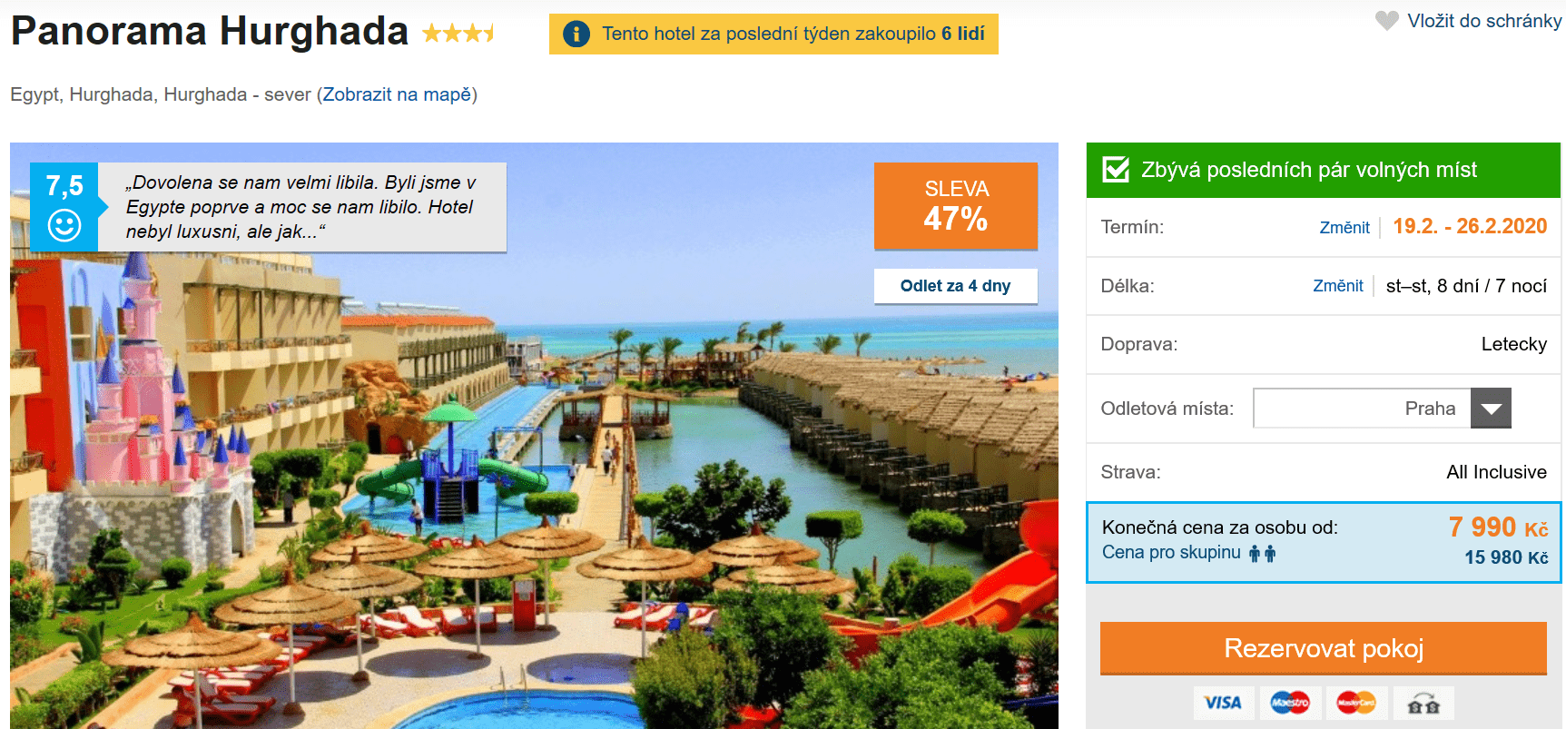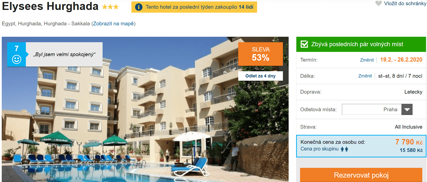 Již tuto středu se můžete vydat do sluncem vyhřátého Egypta a užít si týdenní bezstarostnou dovolenou, a to již za skvělých 7790 Kč! V této ceně máte zpáteční letenku z Prahy, Brna nebo Ostravy, dopravu na místě, služby delegáta, ubytování a stravování formou All Inclusive. Pouze o 200 Kč dráž pak zakoupíte obdobný zájezd, jen do o něco lépe hodnoceného hotelu. Oba z nich se nachází v letovisku Hurghada. Podrobného průvodce po Egyptě zcela zdarma si můžete přečíst zde.
