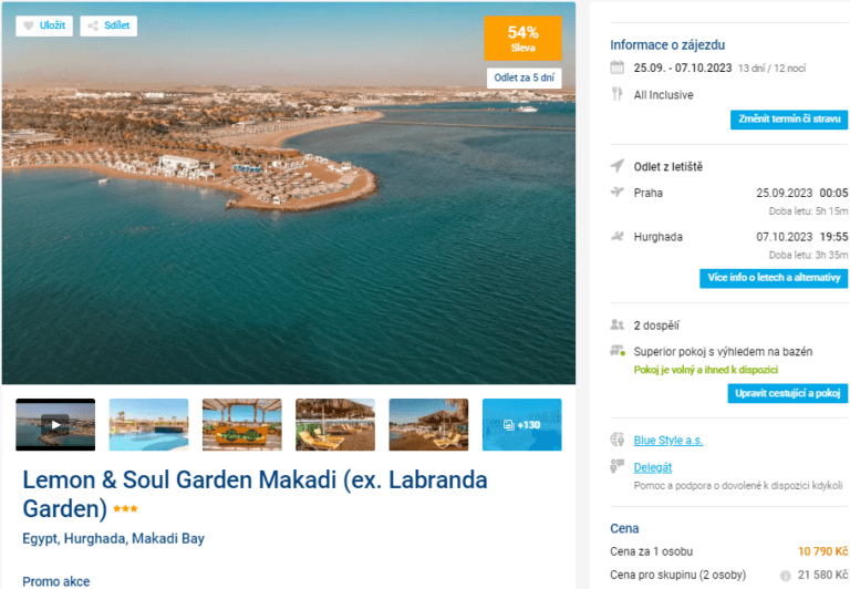 Přinášíme tip na levný zájezd do Egypta za 10790 Kč na osobu. V ceně jsou zahrnuty letenky, služby delegáta, letištní transfery a ubytování na 13 dní s All Inclusive. Hotel se nachází v klidné lokalitě cca 1,5 km od pláže, kam dojíždí hotelový autobus. Na pláži můžete využívat hotelový bar s All Inclusive. Před cestou nakoukněte do našeho průvodce Egyptem.