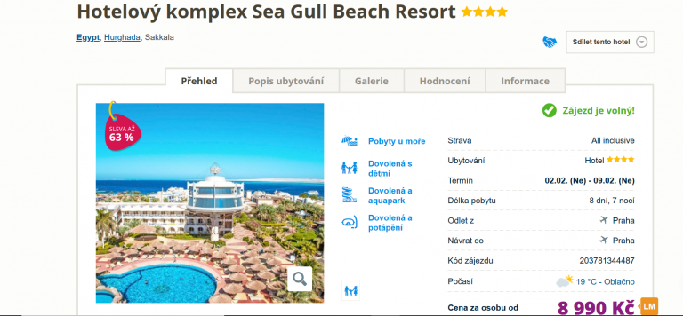 I v lednu si můžete užít cenově dostupnou dovolenou, při níž nachytáte sluneční paprsky. Příkladem je aktuální last minute zájezd od cestovní kanceláře Čedok, se kterou se za 8 990 Kč vypravíte do Egypta a v letovisku Hurghada strávíte příjemných 8 dní. Cena zájezdu zahrnuje zpáteční letenky z Prahy, služby delegáta, transfery mezi letištěm a hotelem, ubytování ve 4hvězdičkovém hotelu a stravování formou all inclusive. Našeho průvodce Egyptem pak najdete zde.