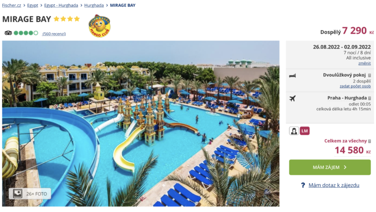 Přemýšlíte, kam vyrazit na konci letních prázdnin? V tom případě by vám mohla padnout do oka právě tato last minute nabídka. Zájezd do 4* hotelu s aquaparkem aktuálně pořídíte za cenu 7 290 Kč. V ceně jsou zahrnuty letenky (odlet z Prahy), letištní transfery v místě, ubytování na 8 dní, stravování formou all inclusive a služby delegáta. Hotel Mirage Bay se nachází nedaleko oblíbeného letoviska Hurghada, přímo u písečné pláže. Rady a tipy na výlety najdete v našem online průvodci Egyptem.