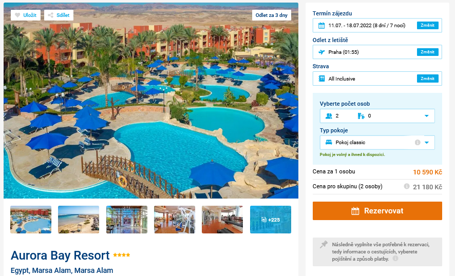 Zajeďte si dobít baterky k moři! S naším dalším tipem se můžete vydat do Egypta a to již za pár dní. Za zájezd s cestovní kanceláří zaplatíte jen 10 590 Kč a cena zahrnuje ubytování na 8 dní, zpáteční letenky z Prahy, letištní transfery, stravu All Inclusive a služby delegáta. Hotel Aurora Bay Resort najdete v destinaci Marsa Alam, jen kousek od korálového útesu Jabal Al Rosas. Pokud vás tento tip zaujal, dovolenou si užijete v termínu 11.7. – 18.7.2022. Inspiraci na výlety můžete načerpat v našem online průvodce Egyptem, ve kterém najdete informace o jednotlivých letoviscích.