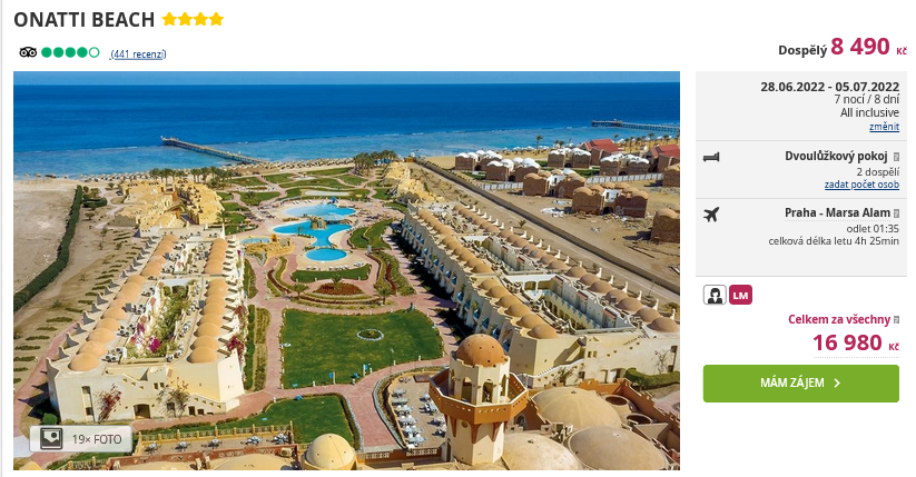Užijte si dovolenou v Egyptě za skvělou cenu! Díky nabídce Last Minute pobytů pořídíte týdenní dovolenou ve 4* resortu jen za 8 490 Kč. V ceně je zahrnuto ubytování na 8 dní, All Inclusive, zpáteční letenky z Prahy, letištní transfery a služby delegáta. Onatti Beach Resort najdete přímo u moře a hosté zde mají slunečníky i lehátka k dispozici zdarma. Před cestou nezapomeňte nakouknout do našeho online průvodce Egyptem, ve kterém najdete tipy na výlety a informace o jednotlivých letoviscích.
