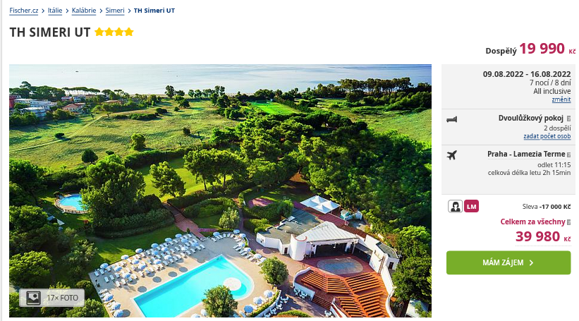 Polovina léta už je za námi a vy jste ještě nebyli na svojí vysněné dovolené? Pojďte tuto chybu napravit a vyrazte s naším tipem do Kalábrie. Zájezd organizuje CK a termín pobytu je již v první polovině srpna. Cena 19 990 Kč zahrnuje ubytování v hotelu na 8 dní, stravu All Inclusive, zpáteční letenky z Prah, letištní transfery a služby delegáta. Hotel TH SIMERI UT leží v letovisku Simeri, přímo u písečné pláže. Hosté zde mají lehátka i slunečníky zdarma. Před cestou určitě nakoukněte do našeho online průvodce Itálií, kde najdete tipy a rady pro vaši cestu.