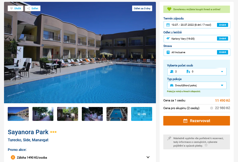 Postřehli jste zájezd s cestovní kanceláří do Turecka, který jsme vám před několika dny ukazovali? Pokud nikoli, nebo jste s nákupem čekali, dnes vám uděláme radost. Pobyt totiž zlevnil a za celou dovolenou nyní zaplatíte jen 11 490 Kč. Cena zahrnuje ubytování na 8 dní v hotelu s programem All Inclusive, zpáteční letenky, letištní transfery a služby delegáta. Odlet je z Karlových Varů a dovolenou si užijete v termínu 13.7. – 20.7.2022. Hotel Sayanora Park leží v letovisku Side, jen 150m od moře. Rady a tipy na výlety najdete v našem online průvodci Tureckem.