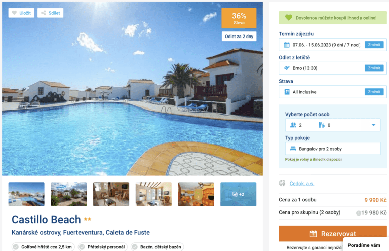 S naším dalším dnešním tipem můžete zamířit na Kanárské ostrovy! V nabídce cestovní kanceláře se objevil last minute zájezd na ostrov Fuerteventura s odletem z Brna. V ceně zájezdu 9 990 Kč jsou zahrnuty letenky, letištní transfery v místě, ubytování na 8 dní, stravování formou all inclusive a služby delegáta. Hotelový komplex se skládá z několika bungalovů a je situován přibližně 1,5 kilometru od centra letoviska i pláže. Před cestou určitě nakoukněte do našeho podrobného průvodce ostrovem Fuerteventura, ve kterém najdete inspiraci na výlety.