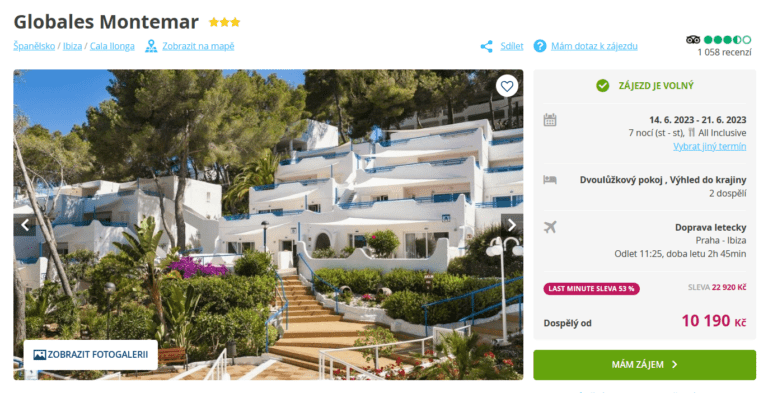 Čekáte na super last minute a toužíte se podívat na Ibizu? Pak pro vás máme skvělý tip! CK Fischer právě nabízí týdenní zájezd do 3* hotelu Globales Montemar za akční cenu 10 190 Kč! V ceně jsou zahrnuty letenky (odlet z Prahy), letištní transfery v místě pobytu, ubytování v hotelu na 7 nocí, stravování all inclusive a služby delegáta.