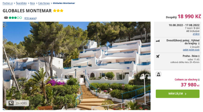 Dalším místem, kam vás s našimi tipy pozveme, je španělská Ibiza. Sem se můžete podívat díky Last Minute nabídce, která se právě objevila na stránkách cestovní kanceláře Fischer. Dovolenou si užijete již v termínu 10.8. – 17.8.2022 a to za skvělou cenu 18 990 Kč. Ta zahrnuje ubytování v hotelu na 8 dní se stravou All Inclusive, zpáteční letenky z Prahy, letištní transfery a služby delegáta. Hotel Globales Montemar leží v letovisku Cala Ilonga na jihovýchodě ostrova a děti i dospělí se mohou těšit na bohaté animační programy. Před cestou se nezapomeňte inspirovat v našem podrobném průvodci Ibizou, ve kterém najdete tipy na výlety a informace o ostrově.