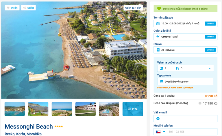 Hledáte Last Minute dovolenou s odletem z Ostravy? Potom by se vám mohl líbit tento tip na pobyt s cestovní kanceláří. Již zítra se můžete podívat na oblíbený ostrov Korfu a strávit zde pohodový týden! Cena 8 990 Kč zahrnuje ubytování v hotelu na 8 dní se stravou All Inclusive, zpáteční letenky, letištní transfery a podporu delegáta. Hotel Messonghi Beach stojí v destinaci Moraitika, přímo u pláže s pozvolným vstupem do moře. Před cestou nezapomeňte nakouknout do našeho podrobného průvodce ostrovem, ve kterém najdete tipy na výlety a informace o Korfu.