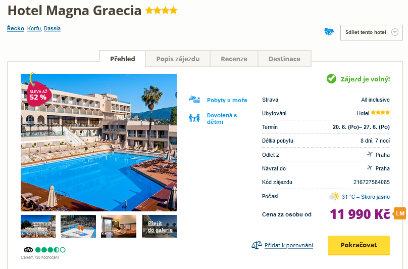 Toužíte se letos podívat na Korfu? Pak rozhodně pokračujte ve čtení. V našem dalším tipu vám totiž ukážeme pobyt s cestovní kanceláří, za který zaplatíte jen 11 990 Kč. Cena zahrnuje ubytování ve 4* hotelu, stravu All Inclusive, zpáteční letenky z Prahy, letištní transfery a služby delegáta. Hotel Magna Graecia stojí v letovisku Dassia, které je vhodné jako výchozí bod pro poznání ostrova. Před cestou nezapomeňte nahlédnout do našeho online průvodce po Korfu, ve kterém najdete informace o zajímavých místech.