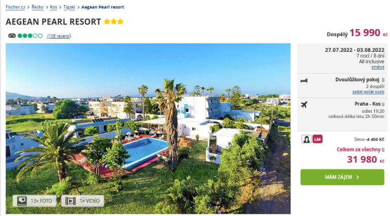 Hoďte starosti za hlavu a vydejte se na řecký ostrov Kos! Podívat se sem můžete zcela bez starostí díky organizovanému zájezdu. Celá dovolená vás vyjde na 15 990 Kč a cestovní kancelář se vám postará o ubytování v hotelu s programem All Inclusive na 8 dní, zpáteční letenky z Prahy, letištní transfery a služby delegáta. Hotel Aegean Pearl Resort *** najdete v destinaci Tigaki, v jehož centru se nachází množství barů, restaurací a taveren. Pokud využijete této nabídky, pobyt si užijete v termínu 27.7. – 3.8.2022. Rady a tipy na výlety najdete v našem podrobném průvodci tímto ostrovem.