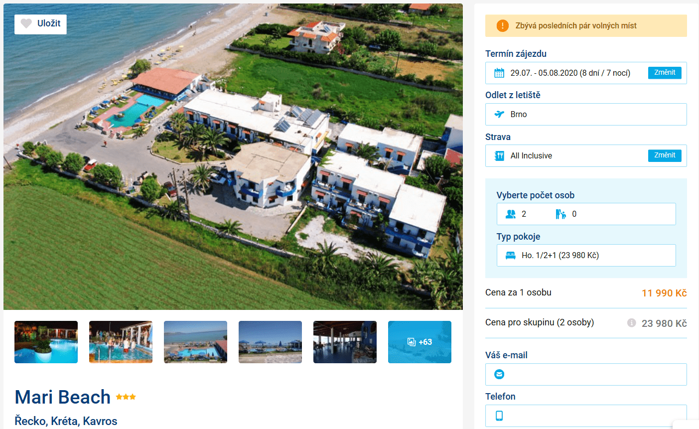 Využijte posledních míst a vydejte se následující středu na Krétu. Ta okouzlí jak oddané milovníky povalování na pláži, tak aktivní turisty. Za cenu 11 990 Kč si však užijete bezstarostnou dovolenou, při níž nebudete muset hnout prstem. V ceně jsou zahrnuty zpáteční letenky z Brna, doprava na místě, služby delegáta, ubytování a stravování formou All Inclusive na 8 dní. Podrobného průvodce po Krétě zcela zdarma pak naleznete zde.